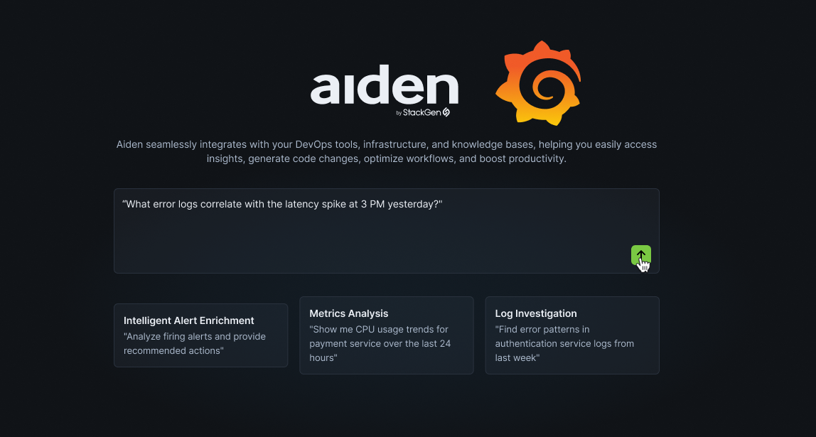 Aiden acts as an intelligent layer on top of your Grafana observability stack, transforming it from a data visualization tool into a proactive operations platform. Instead of manually writing PromQL queries or navigating dashboards, you can ask questions in plain English like "Show me CPU usage trends for the payment service over the last 24 hours" or "What error logs correlate with the latency spike at 3 PM yesterday?" Aiden automatically queries your Grafana datasources (Prometheus, Loki), analyzes the data, and provides actionable insights—reducing investigation time from hours to minutes.